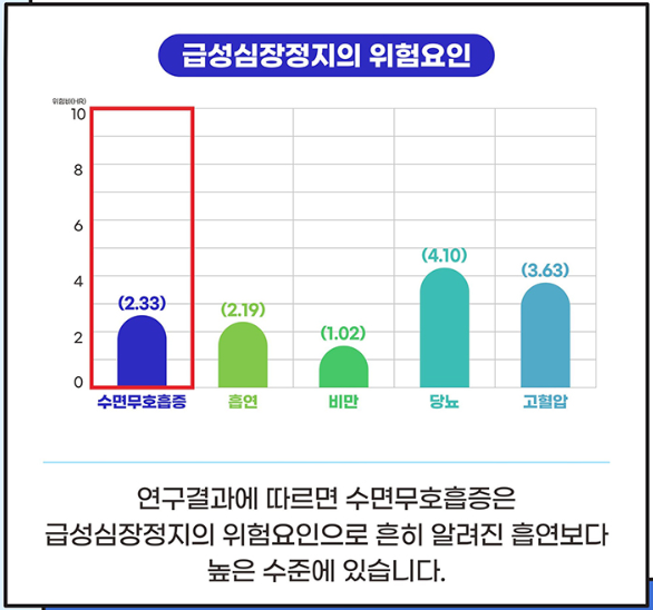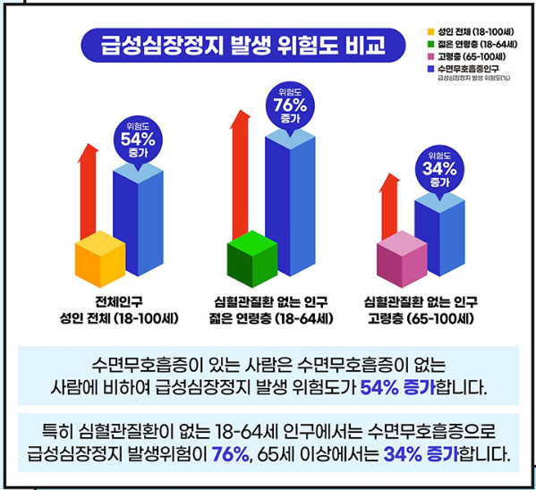 국내 수면무호흡증 환자가 5년 새 3배 증가했으며, 연구에 따르면 수면무호흡증 환자는 급성심장정지 발생 위험이 비환자에 비해 54% 증가하는 것으로 나타났습니다.