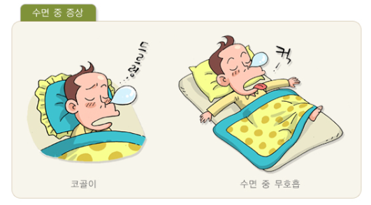 ▶호흡 중단: 수면 중 갑작스러운 호흡 중단 또는 헐떡이는 소리.