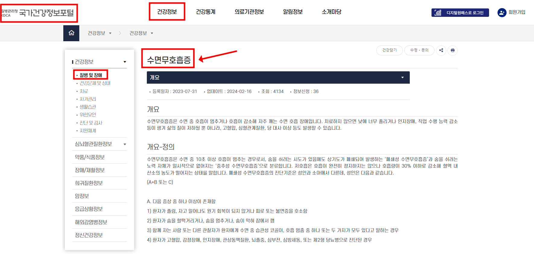 질병관리청 국가건강정보포털 홈페이지 접속한 후 건강정보>질병 및 장애 메뉴에서 수면무호흡증을 검색하시면 더 자세한 정보를 확인할 수 있습니다.