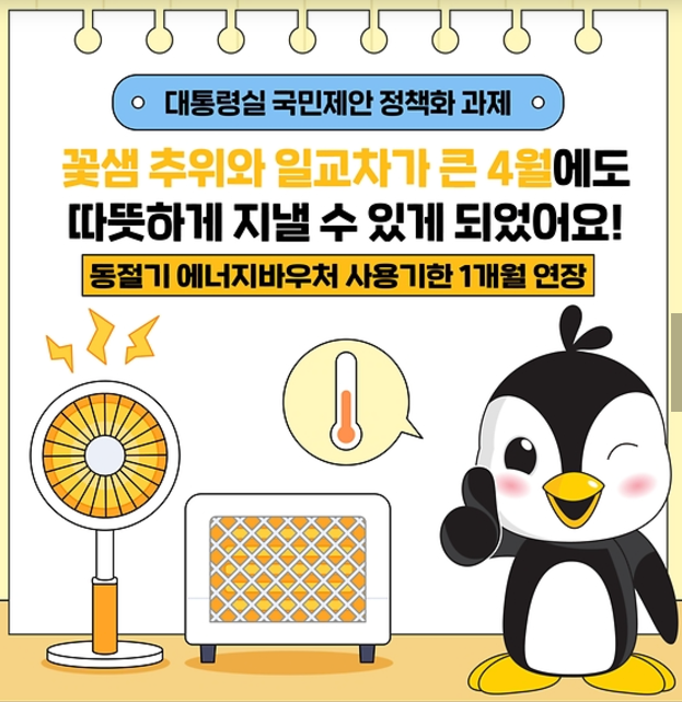 정부가 에너지 바우처의 지원금액을 전년 대비 1만 원 인상하고, 사용기간을 1개월 연장하며 지원을 대폭 강화했습니다.