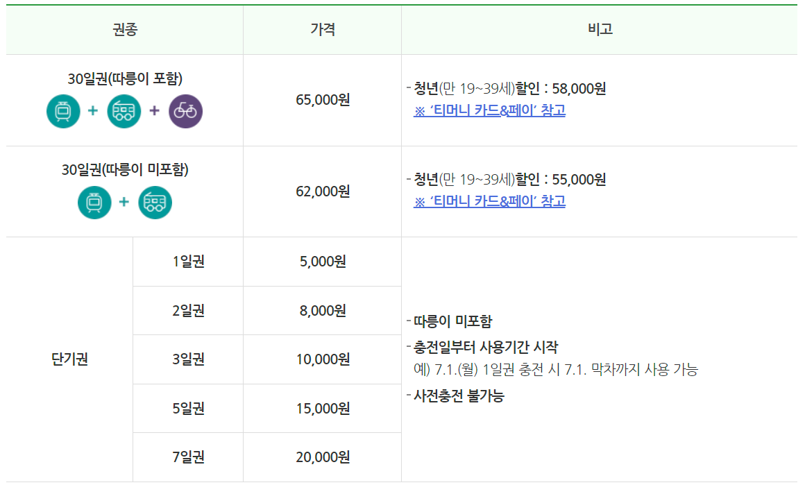 만 19세부터 39세까지의 청년층은 할인 혜택이 있어, 따릉이 포함 시 5만 8천 원, 미포함 시 5만 5천 원으로 이용할 수 있습니다.