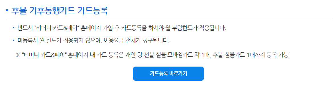 1)카드 등록 필수: 카드를 발급받은 후 티머니 누리집에 반드시 등록해야 합니다.