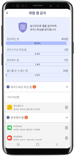 ▶‘전화사기 악성 앱’, ‘원격제어 앱’, ‘출처를 알 수 없는 앱’ 등의 카테고리로 구분됩니다.