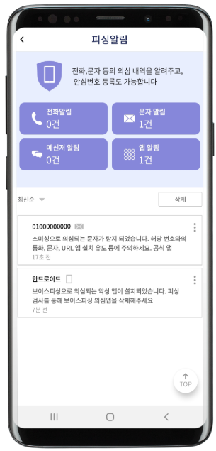 특히, 수사기관을 사칭하여 악성 앱 설치를 유도하는 경우, 이를 탐지하여 경고해주는 기능이 있습니다.
