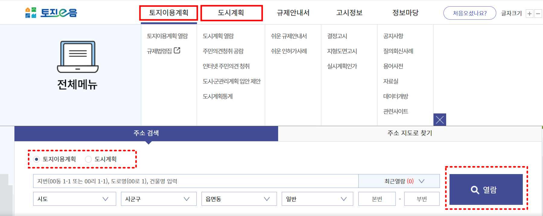▶홈페이지에서 지번 또는 주소를 입력하면 해당 지역 토지의 이용계획 및 규제 내용을 확인할 수 있습니다