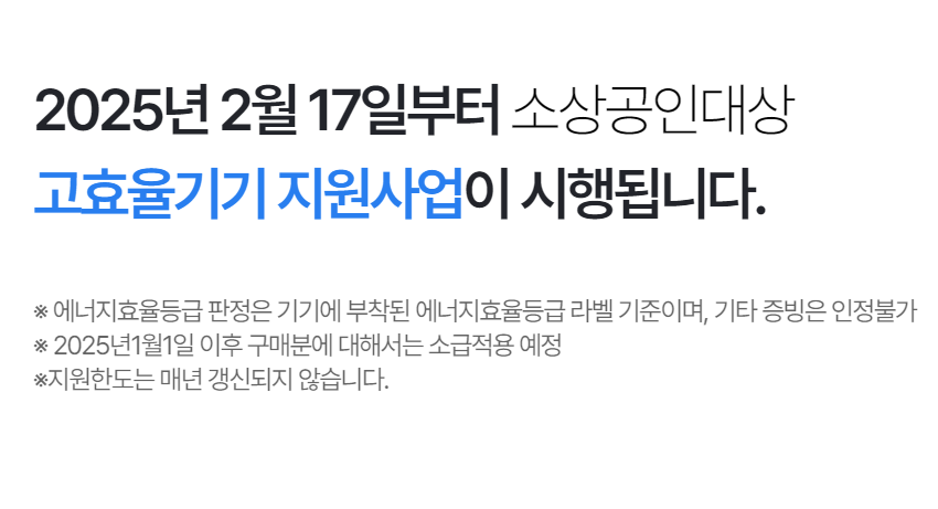 2025년 2월 17일부터 소상공인대상 고효율기기 지원사업이 시행됩니다. ※ 에너지효율등급 판정은 기기에 부착된 에너지효율등급 라벨 기준이며, 기타 증빙은 인정불가 ※ 2025년1월1일 이후 구매