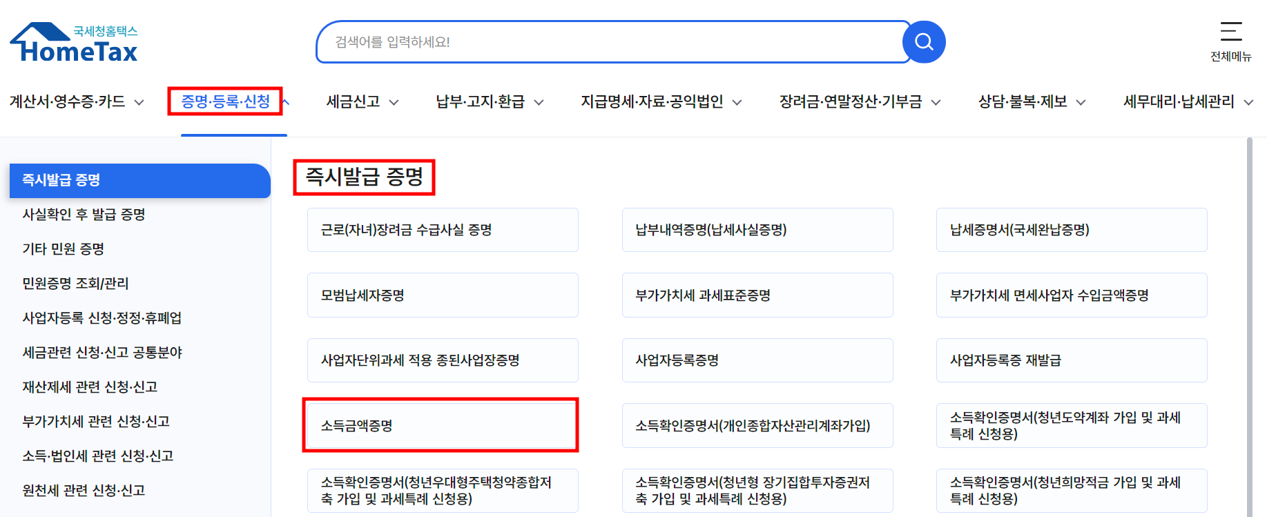 하위 메뉴에서 "소득금액증명"을 선택합니다.