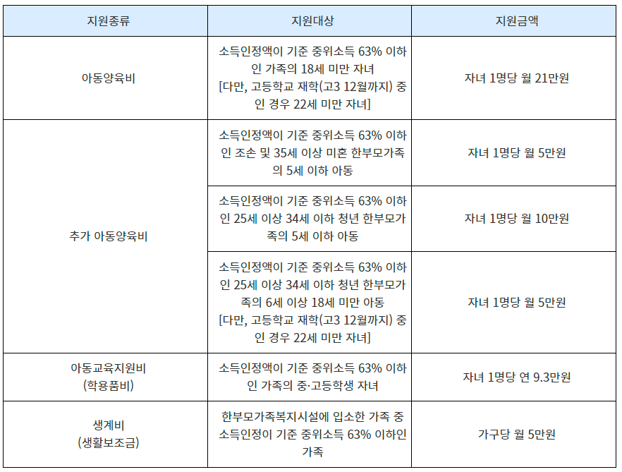 단, 고등학교 재학 중인 경우 22세 미만 자녀까지 지원 대상에 포함됩니다. 이 지원은 아동의 건강한 성장과 가정의 생활 안정을 도모하기 위한 것입니다.