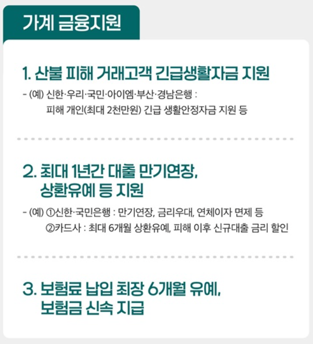 산불 피해를 입은 개인은 긴급 생활자금을 지원받을 수 있으며, 자금 상환 기한 연장상환 유예 등의 조치를 받을 수 있습니다.
