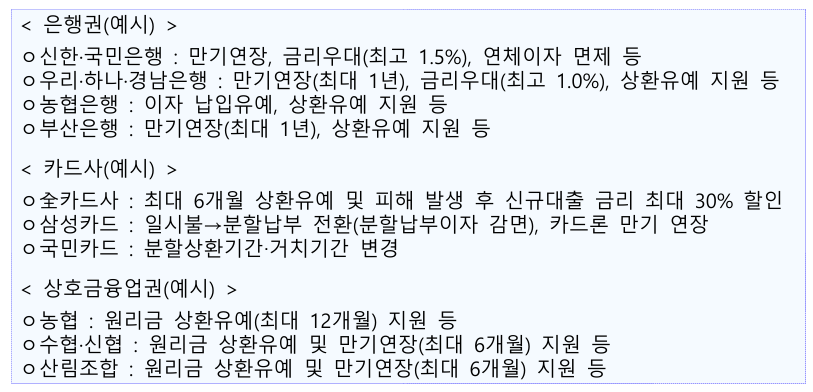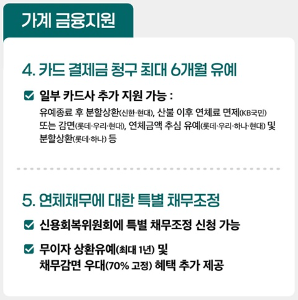카드사의 경우 최대 6개월까지 상환 유예가 가능하며, 피해 이후 신규 자금 지원에 대한 금리 할인도 제공됩니다. 자세한 사항은 카드사 홈페이지에서 확인할 수 있습니다.
