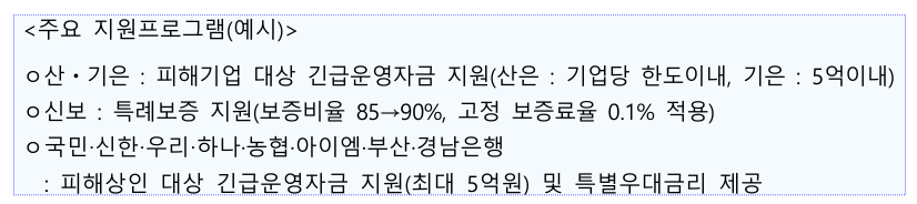 정책금융기관(산업은행, 기업은행)과 은행권에서는 피해를 입은 기업을 대상으로 복구소요자금과 긴급경영안정자금을 지원합니다.