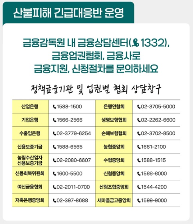 최근 연이은 산불로 인해 많은 분들이 삶의 터전을 잃고 큰 피해를 입었습니다. 이와 같은 재난 속에서 피해를 입은 가정과 기업들이 하루빨리 일상으로 복귀할 수 있도록 정부와 금융기관이 다양한 지원책을 마련하였습니다.