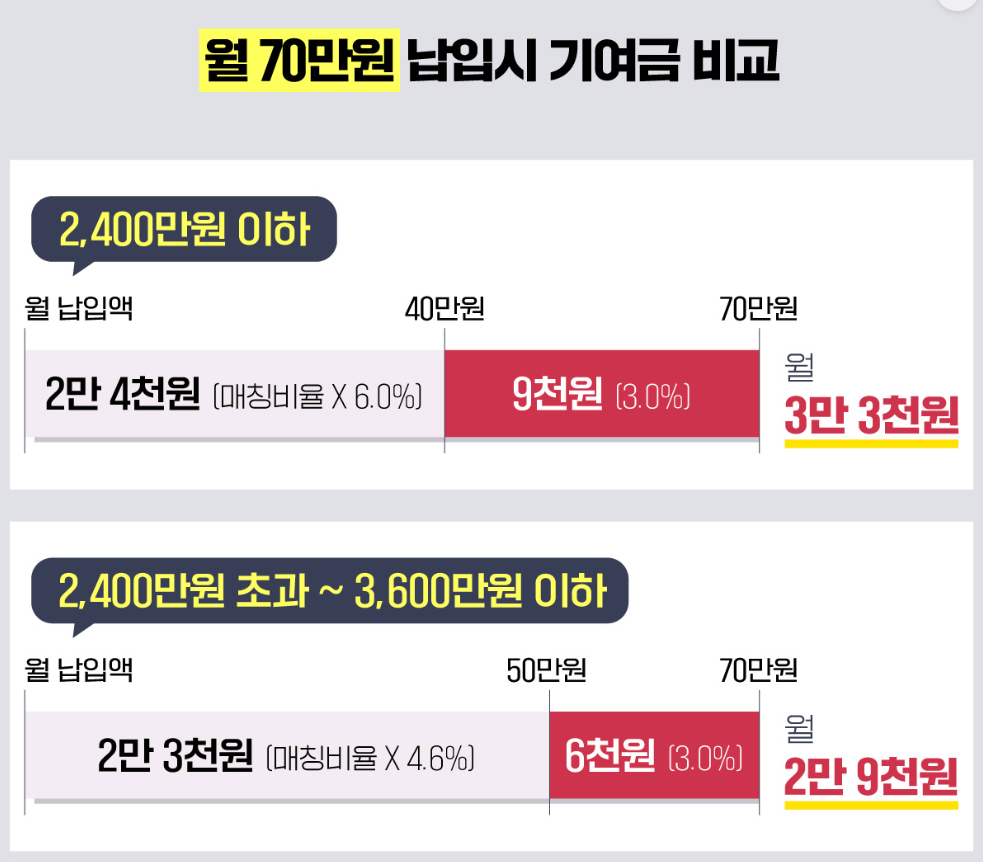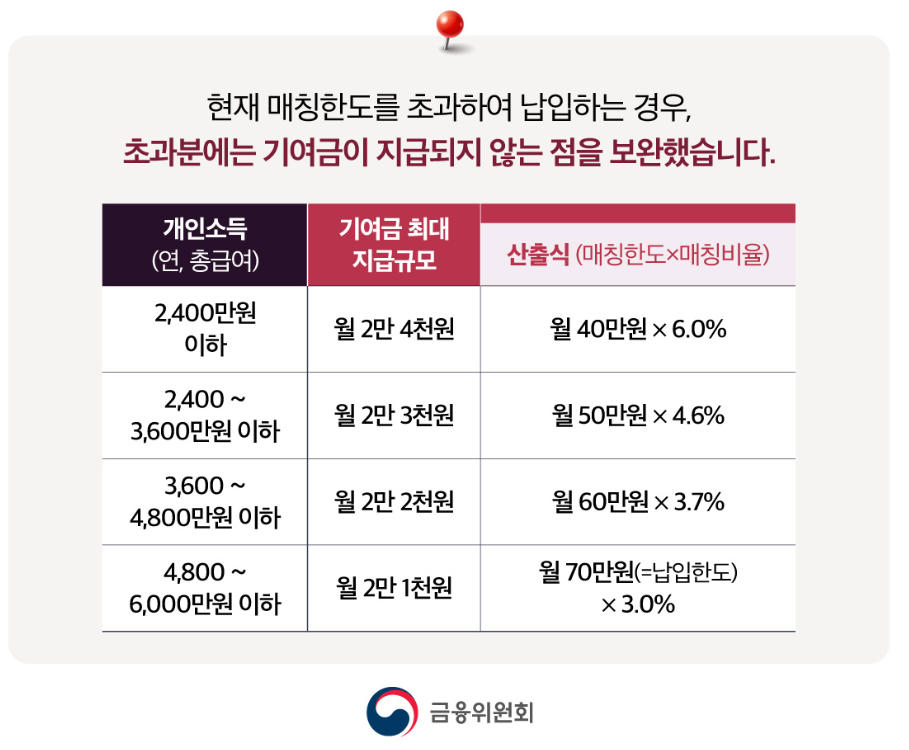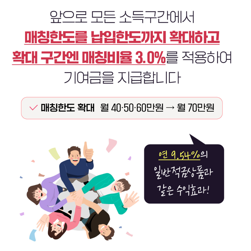 청년들의 저축 의욕을 북돋우기 위해 정부의 기여금 지원이 확대되었습니다. 모든 소득구간에서 매칭한도를 납입한도까지 확대하며, 이 확대된 구간에 매칭비율 3.0%를 적용하여 기여금을 지급합니다. 이는 청년들의 자산 형성 속도를 크게 높여줄 수 있는 중요한 혜택입니다.
