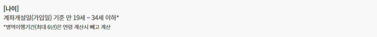 가입일 기준 만 19세에서 34세 이하의 청년이 대상입니다. 다만, 병역을 이행한 경우 해당 기간(최대 6년)은 나이 계산에서 제외됩니다. 따라서 군 복무를 마친 청년은 만 40세까지 가입이 가능합니다.