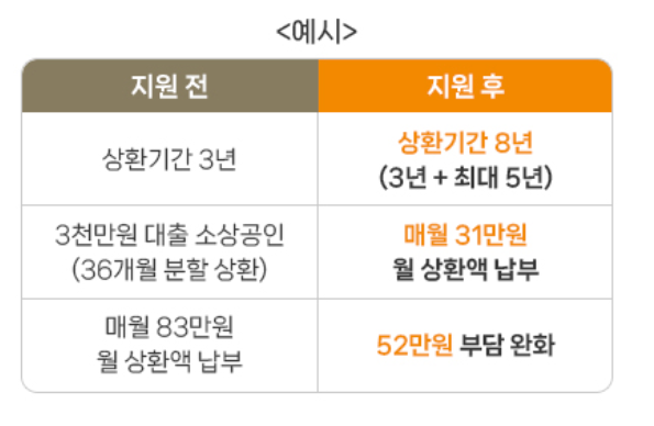기존에 매월 83만 원을 갚아야 했던 소상공인이 상환 연장 제도를 이용하게 되면, 매월 31만 원만 상환하면 됩니다.