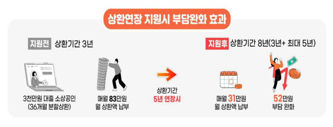 상환 연장 제도를 통해 소상공인들은 최대 5년(60회차)까지 상환 기간을 연장할 수 있습니다. 이를 통해 매달 납부해야 하는 원리금 부담을 줄일 수 있습니다.
