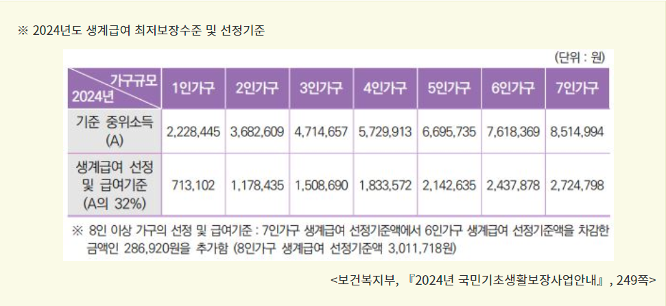 2024년 생계급여 선정 및 급여 기준은 중위소득 32% 이하이며 가구구성 이원 수에 따라 생계급여 지원액이 다릅니다.