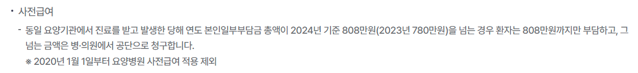 사전급여: 병원에서 발생한 초과 의료비를 공단이 직접 병원에 지급하는 방식입니다. 환자는 초과금에 대해 병원에서 부담하지 않고 자동으로 조정됩니다.