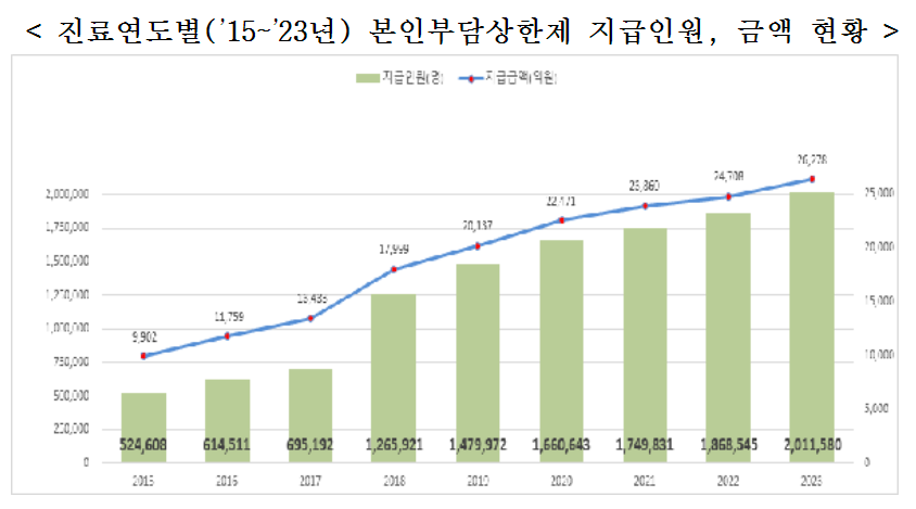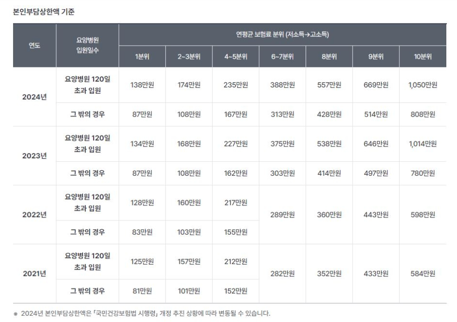 2024년 기준, 소득구간에 따라 본인부담 상한액은 1분위(저소득층) 87만 원, 10분위(고소득층) 808만 원으로 구분됩니다.