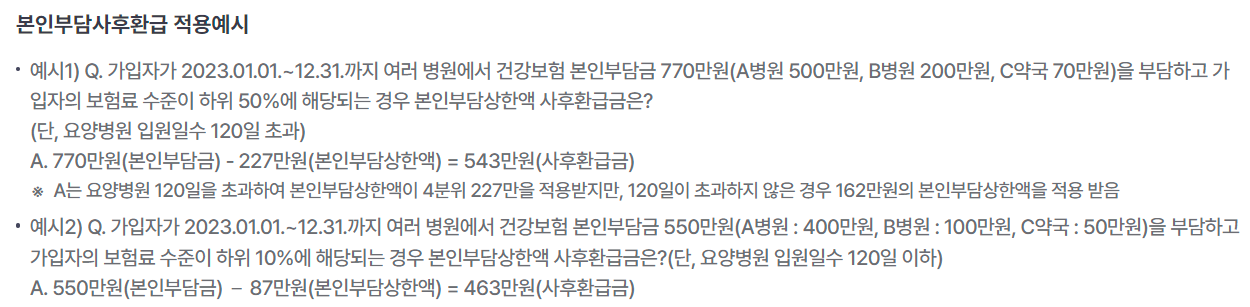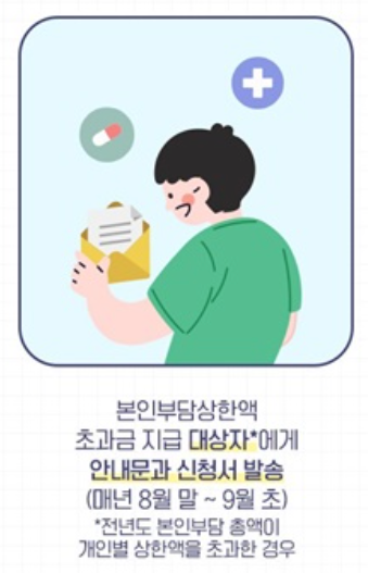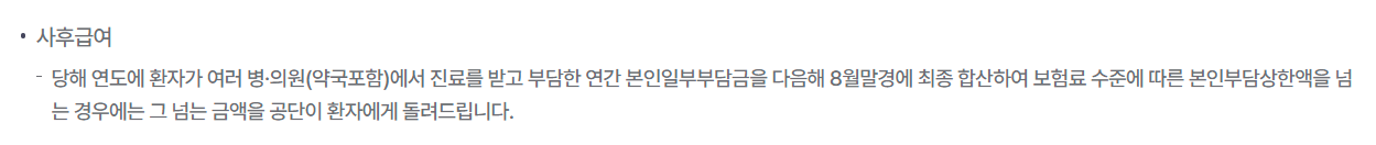 사후급여: 연간 누적된 의료비가 상한액을 초과한 경우, 공단에서 대상자에게 통지하고, 환급 신청을 받은 후 초과 금액을 지급하는 방식입니다.