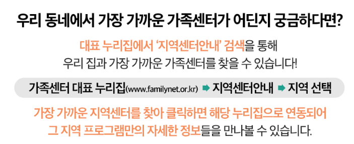 가족센터 대표 누리집에서 ‘지역센터안내’ 검색을 통해 가장 가까운 가족센터를 쉽게 찾을 수 있습니다.