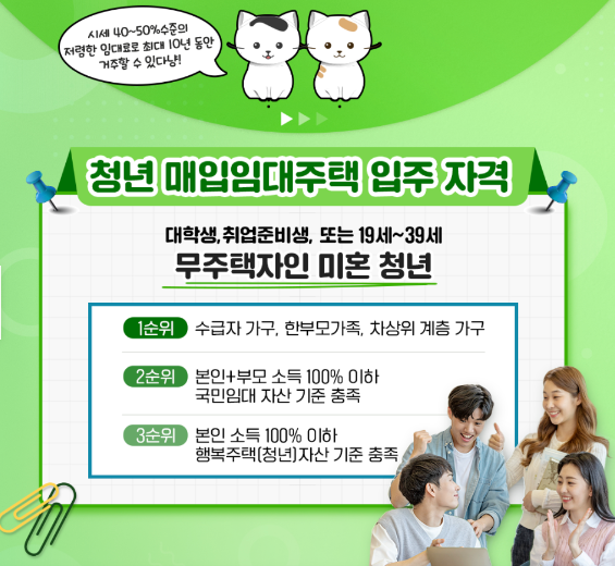 청년 매입임대주택은 무주택 미혼 청년을 대상으로 하며, 시세의 40~50% 수준으로 저렴하게 임대료를 책정하여 최대 10년간 거주할 수 있습니다.