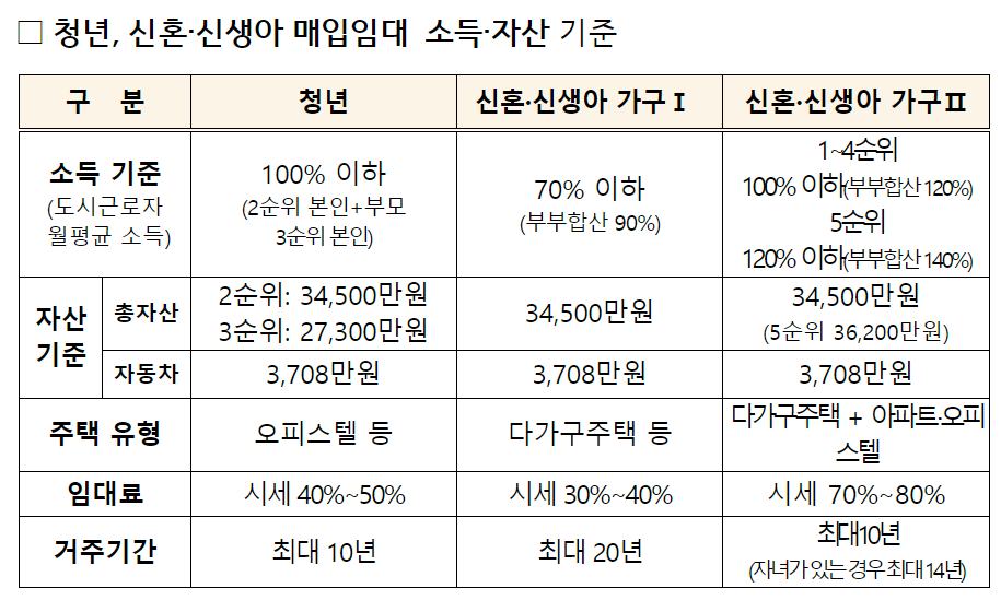 1) 신혼·신생아Ⅰ 유형(892호): 시세30~40% 수준으로, 도시근로자 가구당 월평균 소득의 70% (맞벌이90%)이하인 가구