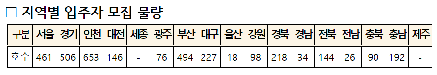 특히, 이번 '24년 3분기 수도권에서는 1,620호가 공급되며, 이 중 서울은 461호, 경기는 506호, 인천은 653호가 배정되었습니다.