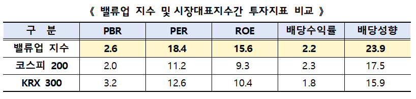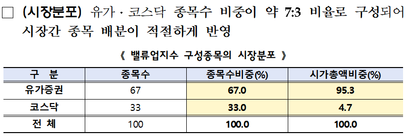 반면, 코리아 밸류업 지수는 주주환원율, 자본 효율성 등 질적 요소를 중심으로 선정된 100개 기업으로 구성되어 있습니다.