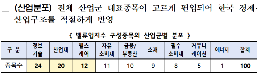주주환원율, 자본 효율성 등 주주가치 지표가 높은 상장기업 100곳으로 구성된 이 지수는, 삼성전자, SK하이닉스와 같은 대표적인 기업뿐만 아니라 비에이치, 경동나비엔 등 기존 지수에는 포함되지 않았던 기업들도 포함시켜 다양성을 확보했습니다.