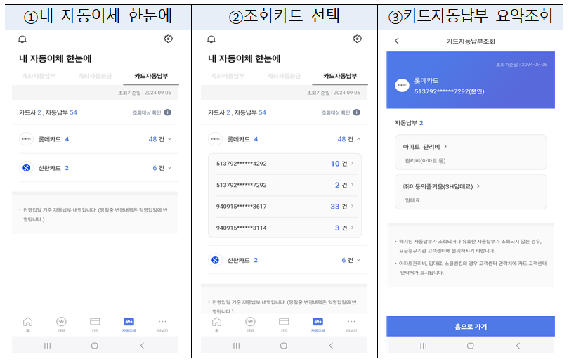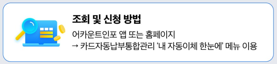 특히, 최근에는 휴면카드 관리와 아파트 관리비 및 공공임대료 카드 자동납부 실시간 변경 기능이 새롭게 추가되면서 금융소비자의 편의가 더욱 개선되었습니다.