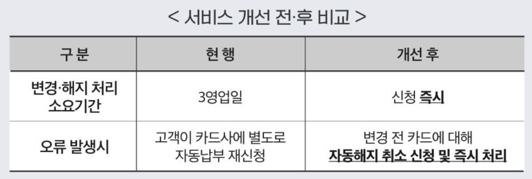 기존에는 카드 변경 후 3영업일이 소요되었으나, 이제는 실시간으로 처리가 가능해졌습니다.
