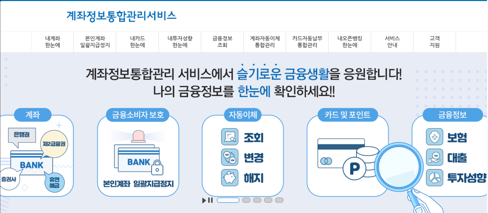 금융소비자가 보유한 다양한 카드와 금융 계좌 정보를 손쉽게 조회하고 관리할 수 있는 서비스입니다.