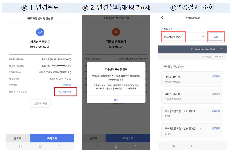 또한, 처리 결과와 함께 신규 카드 자동납부 개시 시점도 안내받을 수 있어 납부 공백으로 인한 미납 가능성을 최소화할 수 있습니다.