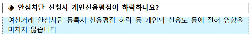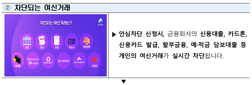 - 여신거래 안심차단 서비스 신청 : 신청이 완료되면 한국신용정보원에 정보가 등록되어 금융회사에서 내 명 의로 대출을 진행할 수 없게 됩니다.