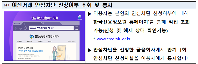 -여신거래 안심차단 확인: 내 정보 메뉴에서 여신거래 차단 신청 내역과 현재 상태를 확인할 수 있습니다.