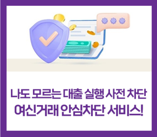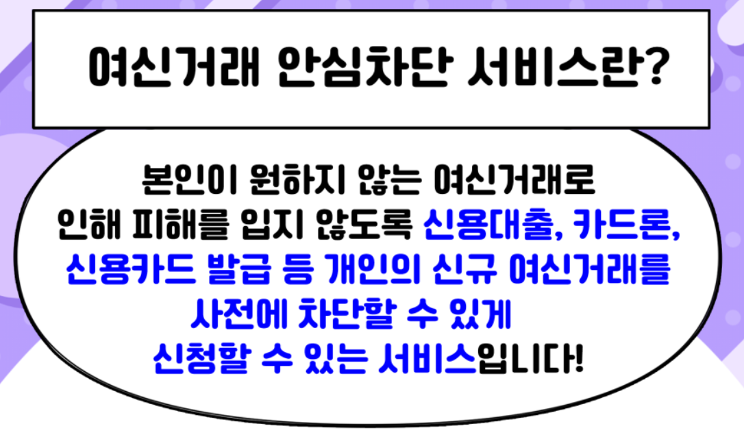 여신거래 안심차단 서비스는 개인의 신규 여신 여신거래를 사전에 차단할 수 있도록 신청할 수 있는 서비스 입니다.