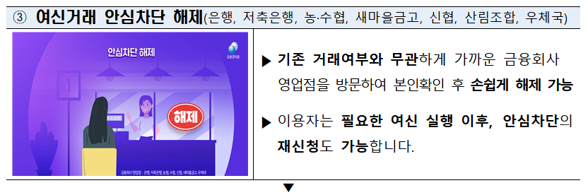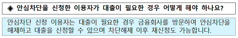 서비스 신청 후, 이용자가 대출 등 여신거래를 진행해야 할 경우, 간단한 해제 절차를 통해 일시적으로 차단을 해제할 수 있습니다.