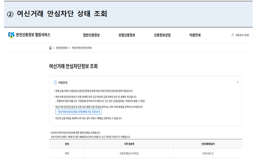-차단 해제 여부: 서비스를 해제한 경우에도 동일하게 한국신용정보원 홈페이지에서 확인 가능합니다.