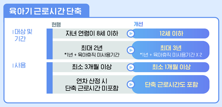 기존에는 자녀가 8세 이하(초등학교 2학년)인 경우에만 근로시간 단축이 가능했지만, 이제는 자녀가 12세 이하(초등학교 6학년)일 때까지 근로시간 단축이 가능합니다.