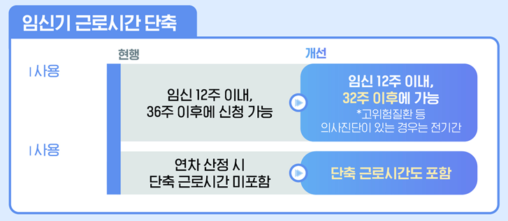 기존에는 임신 12주 이내 및 36주 이후에만 근로시간 단축이 가능했으나, 이제는12주 이내 및 32주 이후로 그 범위가 넓어졌습니다.