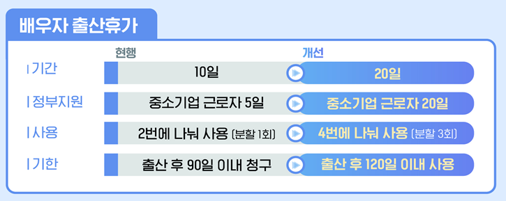 출산 후 배우자의 참여를 독려하기 위한 중요한 변화는 배우자 출산휴가의 확대입니다.