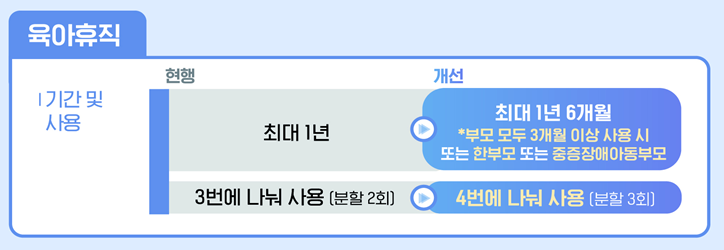 또한 한부모 가정이나 중증 장애아동을 둔 부모의 경우, 육아휴직 기간이 기존 1년에서 1년 6개월로 연장됩니다.