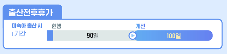 미숙아 출산으로 인해 신생아 집중치료실(NICU)에 입원하는 경우, 출산휴가 기간이 기존 90일에서 100일로 연장됩니다.