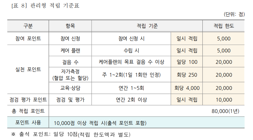 ▶예방형 : 걷기, 건강관리 프로그램 이수, 건강개선(BMI 또는 체중, 혈압, 공복혈당)