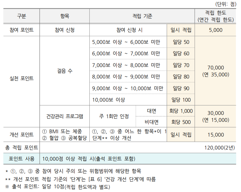 예방형 : 걷기, 건강관리 프로그램 이수, 건강개선(BMI 또는 체중, 혈압, 공복혈당)