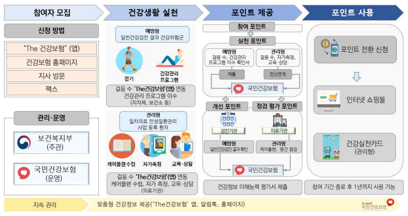 건강관리가 필요한 국민에게 건강생활을 실천하는 과정 등에 대해 금전적 인센티브(포인트)를 제공하는 사업입니다.