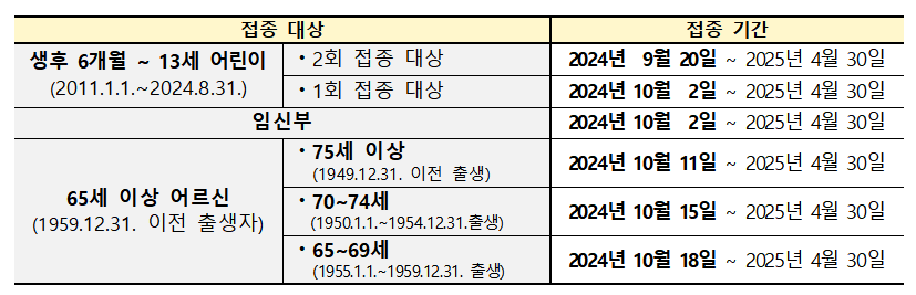 2024-2025절기 인플루엔자 예방접종은 9월 20일부터 시작되며, 무료 접종 대상자는 어린이, 임신부, 65세 이상 어르신입니다.