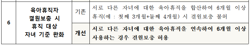 마지막으로 육아휴직자 결원보충시 휴직 대상 자녀 기준도 완화되었습니다.