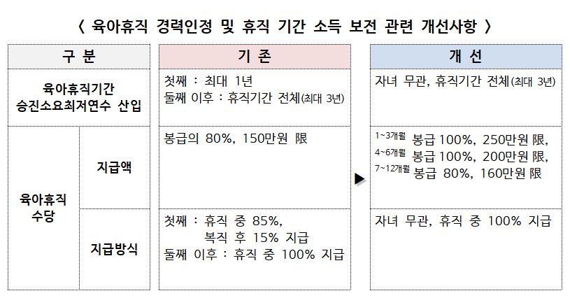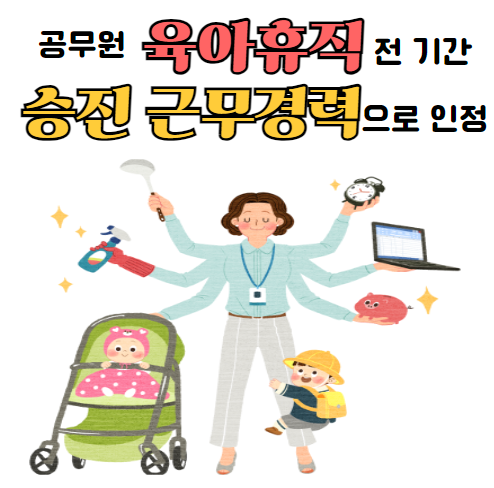 하지만 이번 개정안에 따르면, 자녀의 수에 상관없이 육아휴직 전체 기간이 승진을 위한 근무경력으로 인정됩됩니다.